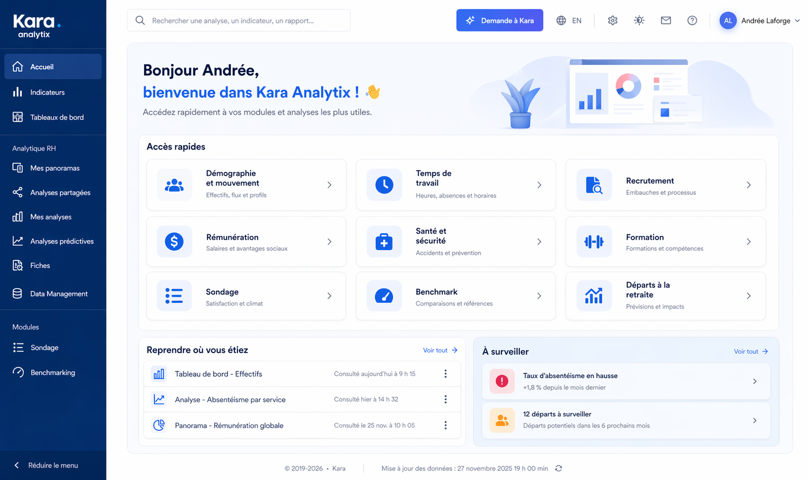 Kara est conçue pour que les équipes RH puissent piloter, comprendre et utiliser leurs données sans dépendre en permanence des équipes TI ou BI.